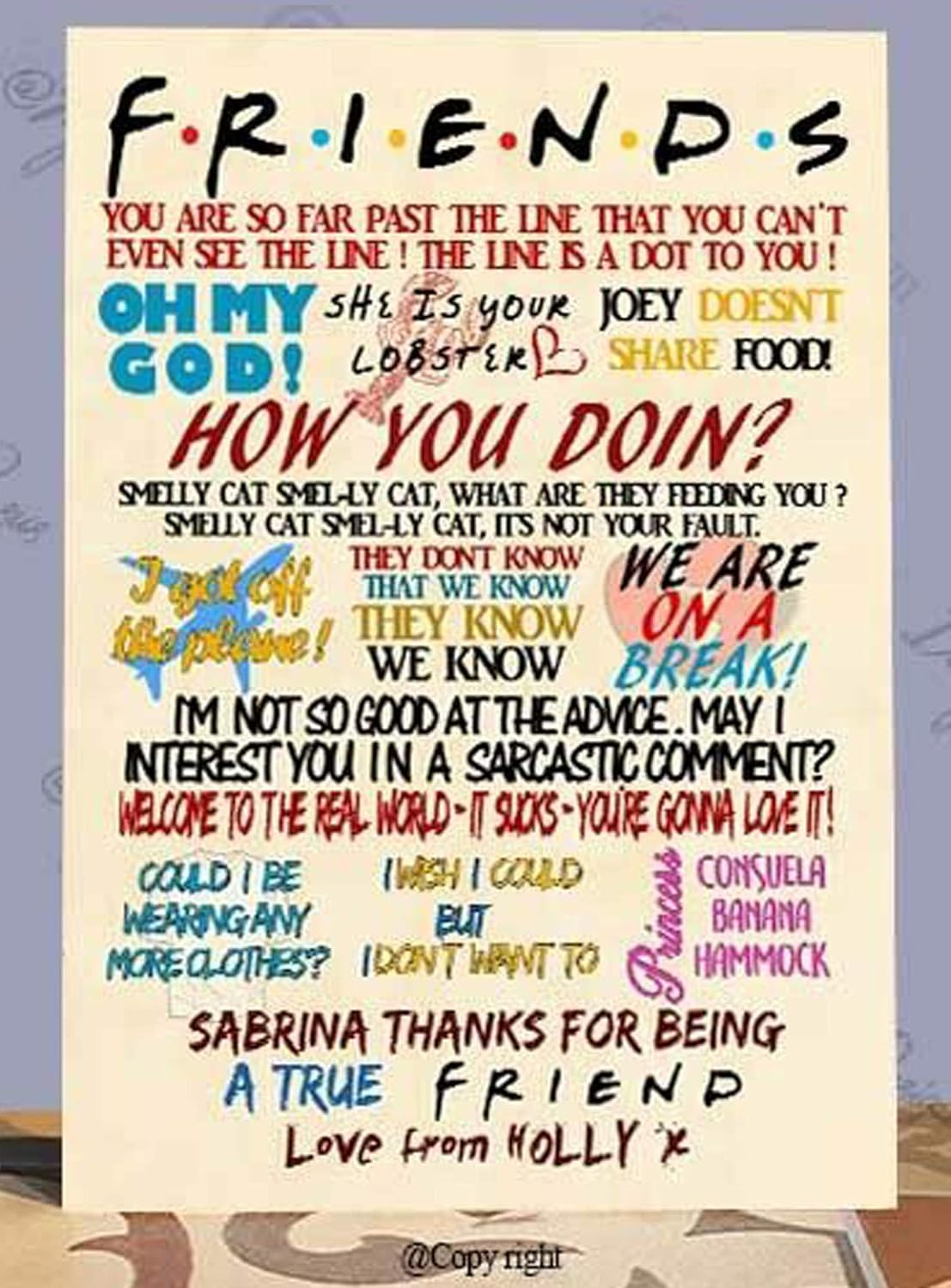 The most memorable friends tv show quotes. 83 birthday quotes, film quotes, movie lines, taglines. 210 love best friend quotes. Most of us remember friends as the best tv show! So i started doing a 30 day of tv meme yesterday, but i realised i watch a lot, a lot, of television. Follow @friendstbt for more friends memes and videos.friends tv quotes friends moments best friend quotes friends tv show gifts serie friends friends episodes joey tribbiani birthday captions. Friends tv show | series shared a post on instagram: Friends tv show quote by phoebe buffay my first episode. Dear readers, google reader and google friend connect are going the way of cassette tapes, so make sure you don't lose your favorite blogs. 13 birthday greetings to a friend. 15 happy birthday special friend. And how do i know that? Not because i want to show off how much i can talk, but because i want.